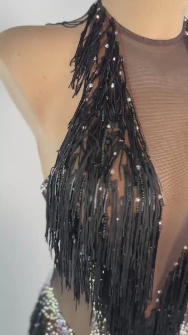 This Chic Black Beads 🖤 Latin/Rhythm dress is a dazzling masterpiece for dancers between 5'3" and 5'6". Designed by Jordy, its elegant black silhouette is enhanced with premium mixed fabrics and adorned with exquisite high-quality stones. Perfect for XS/S sizing, this used-like-new dress combines sophisticated charm, bold flair, and unmatched comfort, making it an ideal choice to captivate on the dance floor. ✨ Price: $2,987.