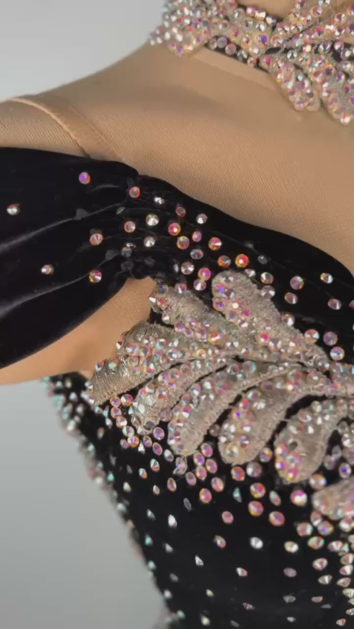 This sophisticated Black Velvet 🖤 Ballroom Dress is a chic and timeless choice for dancers between 5'5" and 5'9". Featuring an elegant black and white design, this dress by GB is crafted from premium mixed fabrics and adorned with high-quality stones that add a touch of sparkle to your performance. In like-new condition, this size S masterpiece combines classic style, effortless grace, and ultimate comfort, ensuring you shine during your next ballroom event. Price: $1,648.