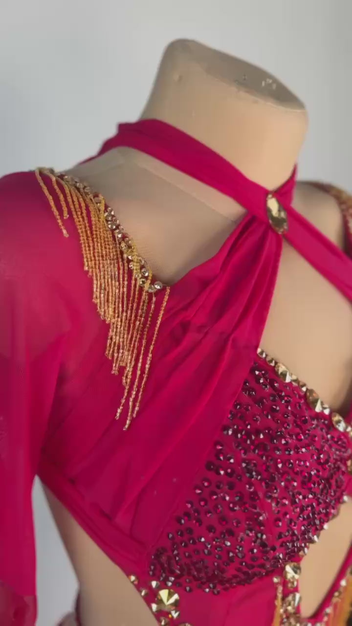 Exude sophistication with the Burgundy Class ✨ Smooth Dress, a timeless masterpiece designed for dancers who radiate elegance. This used-like-new gown fits sizes S/M and is perfect for heights ranging from 5’5” to 5’9”. Featuring a rich burgundy and gold palette, it is crafted by DORE’ with luxurious mixed fabrics and adorned with high-quality stones, making it a dazzling choice for the spotlight.