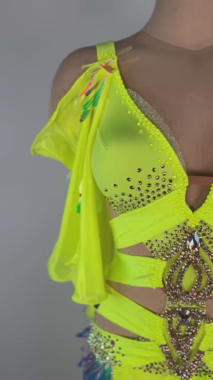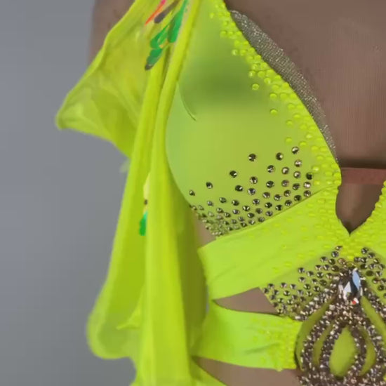 Light up the dance floor with the Fluo Yellow ✨ Smooth Dress, a vibrant and dynamic design that’s impossible to ignore. This used-like-new gown fits sizes XS/S and is ideal for dancers between 5’4” and 5’6”. Crafted by Emelya Design, it features striking Chrisanne fabrics in fluorescent yellow and is adorned with high-quality stones, ensuring you shine brilliantly with every step.