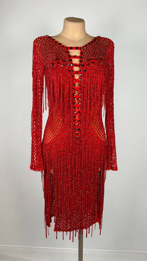 Ignite the stage with Gentil Passion ♥️, a stunning Latin/Rhythm dress by Gentil, Japan 🇯🇵. In a powerful shade of deep red, this brand-new, never-worn masterpiece is crafted from premium mixed fabrics and adorned with high-quality rhinestones, designed to sparkle with every dramatic movement.