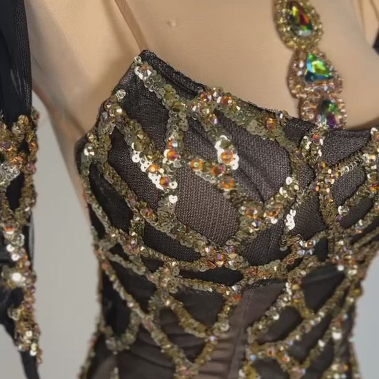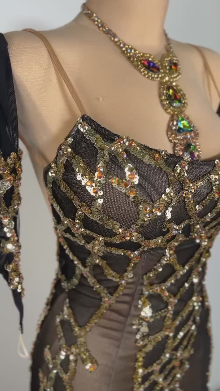 An elegant, used black and gold smooth dress, for small to medium sizes. Made from mixed fabrics and applications, it's in good condition.