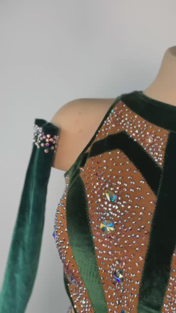 Turn heads with the Green Flirt 🌹 Smooth Dress, a captivating design that brings charm and elegance to the dance floor. This used-like-new gown fits sizes S/M and is tailored for dancers between 5’5” and 5’9”. Designed by DORE’, it features luxurious green mixed fabrics adorned with high-quality stones, ensuring you dazzle with every graceful movement.