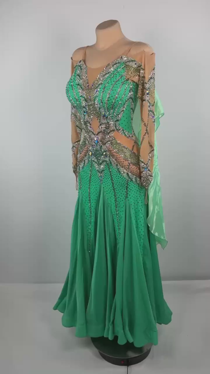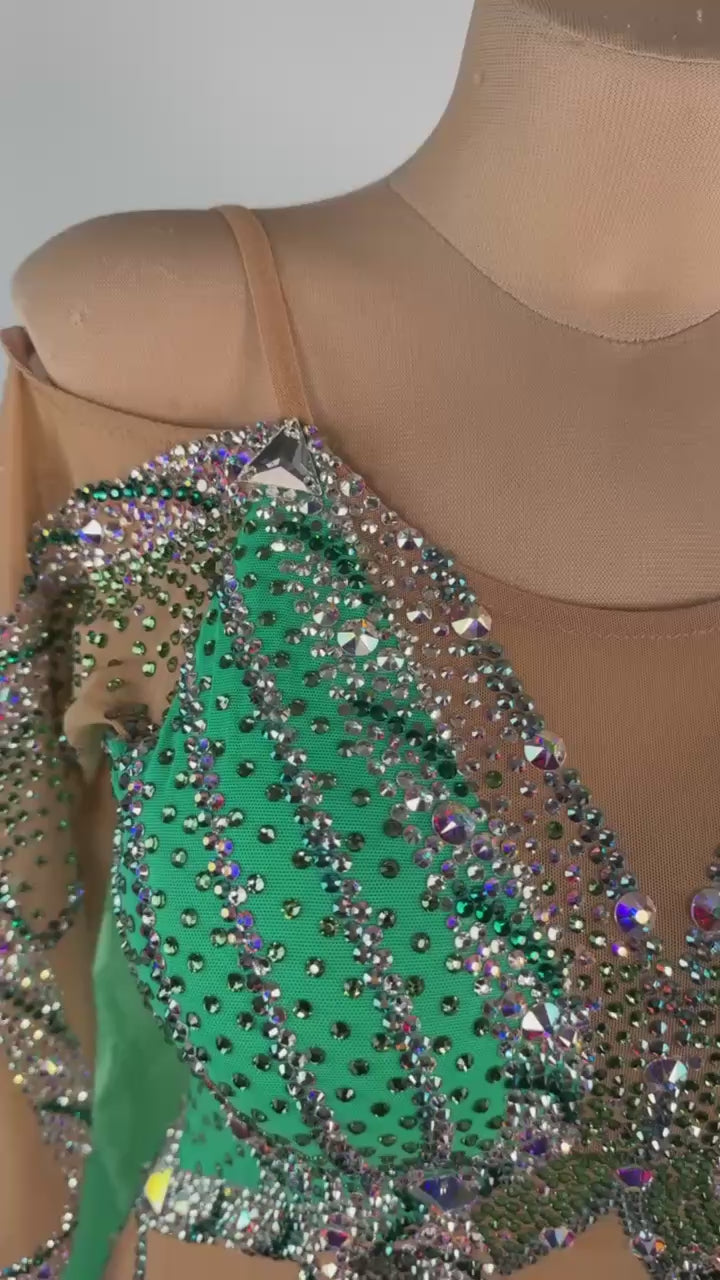 This dazzling Green Lady ๐ Smooth Dress is a radiant masterpiece for dancers between 5'6" and 5'10". The elegant green design by Kalina Design features luxurious mixed fabrics adorned with sparkling Swarovski stones, creating a breathtaking look that flows beautifully on the dance floor. In like-new condition, this size L dress offers the perfect blend of style, comfort, and glamour, making it ideal for your next smooth performance. Price: $2,700.