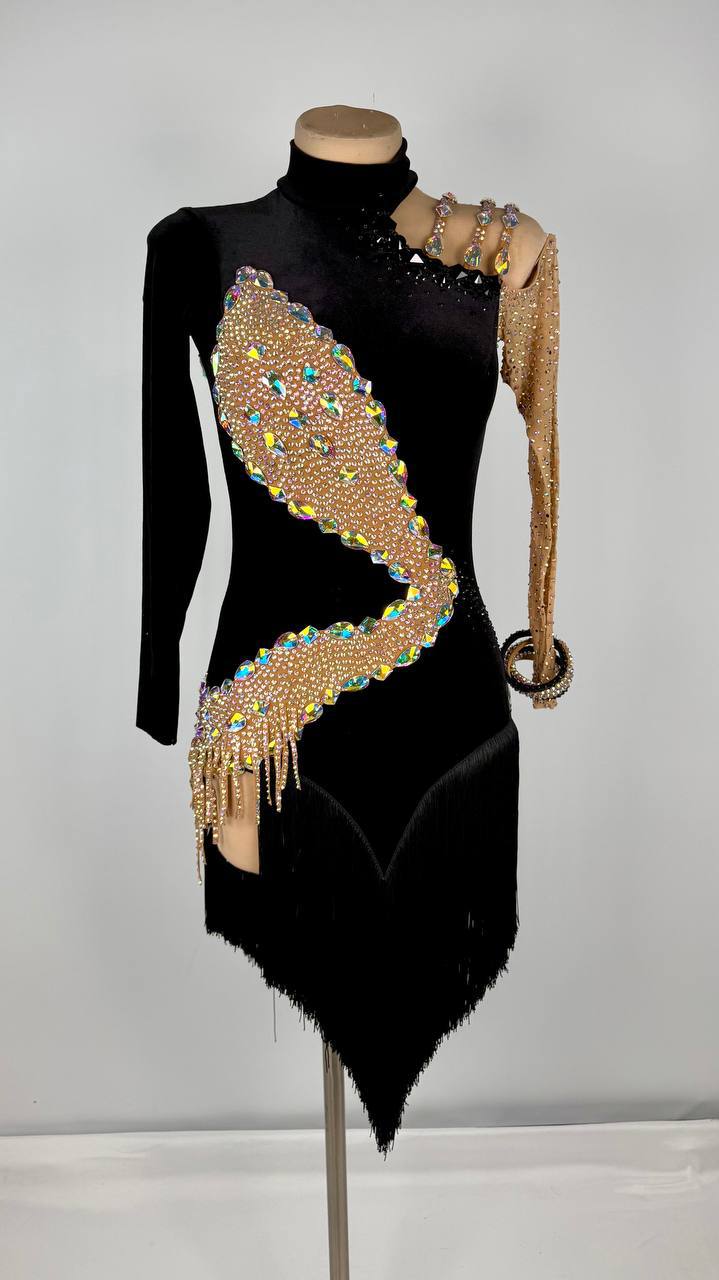 Sleek. Sultry. Sophisticated. Command attention in Half Velvet 🖤, a luxurious Latin dress by Nazar that blends rich textures and refined sparkle. Crafted from premium mixed fabrics and adorned with high-quality rhinestones, this black beauty exudes effortless elegance and bold charm.