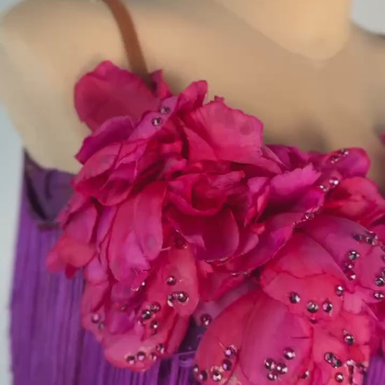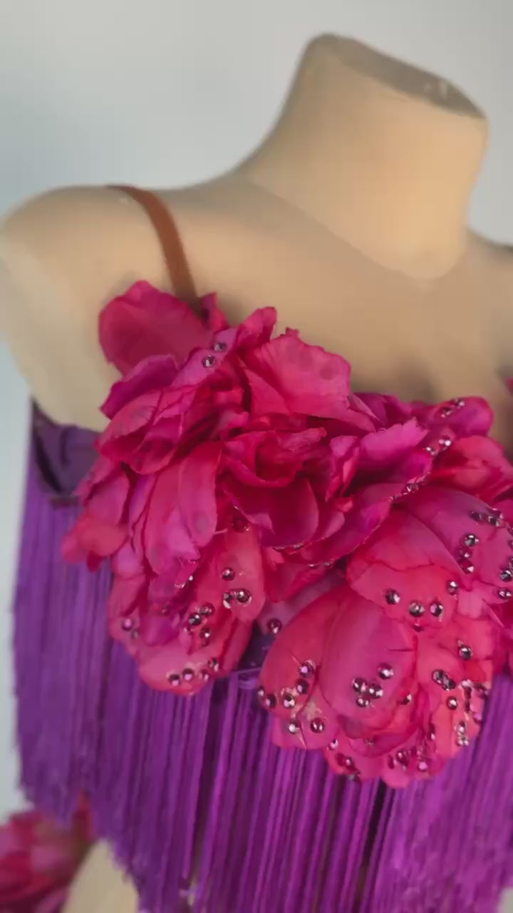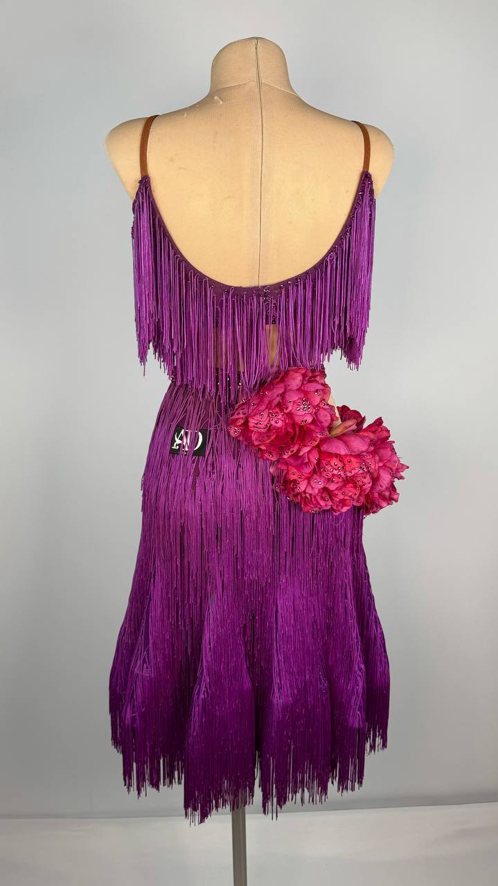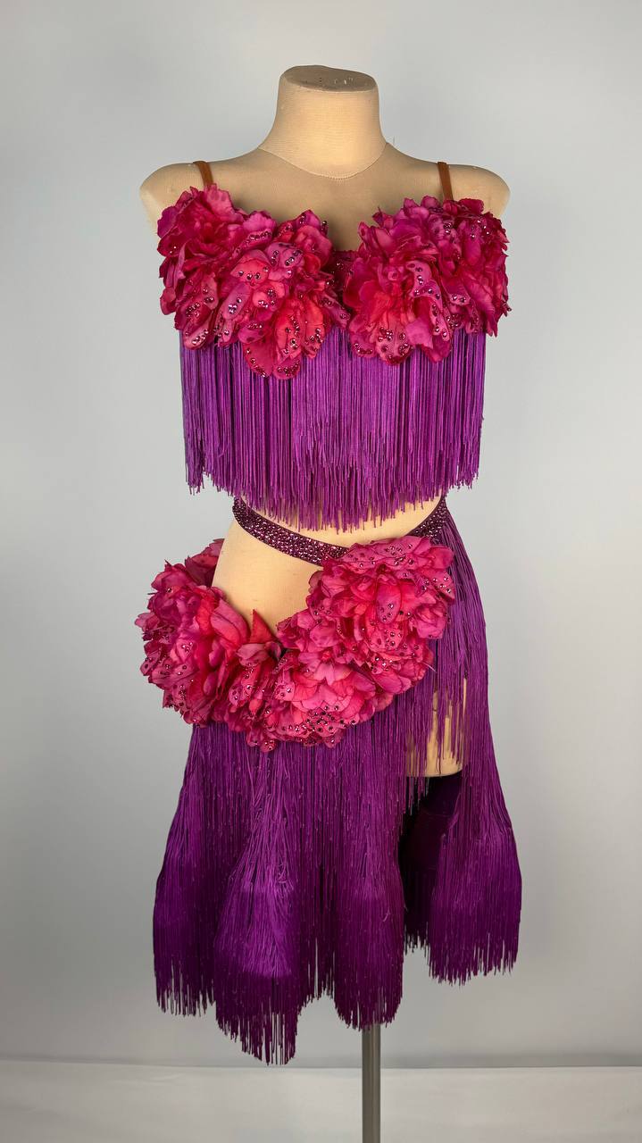 Bring tropical charm to the dance floor with the Hawaiian Flower 🌺 Latin/Rhythm Dress, a vibrant design inspired by the beauty of island blooms. This used-good dress fits sizes S/M and is ideal for dancers between 5’5” and 5’9”. Featuring a striking combination of purple and pink, it is crafted by AD London using luxurious mixed fabrics and adorned with high-quality stones, ensuring you dazzle with every move.