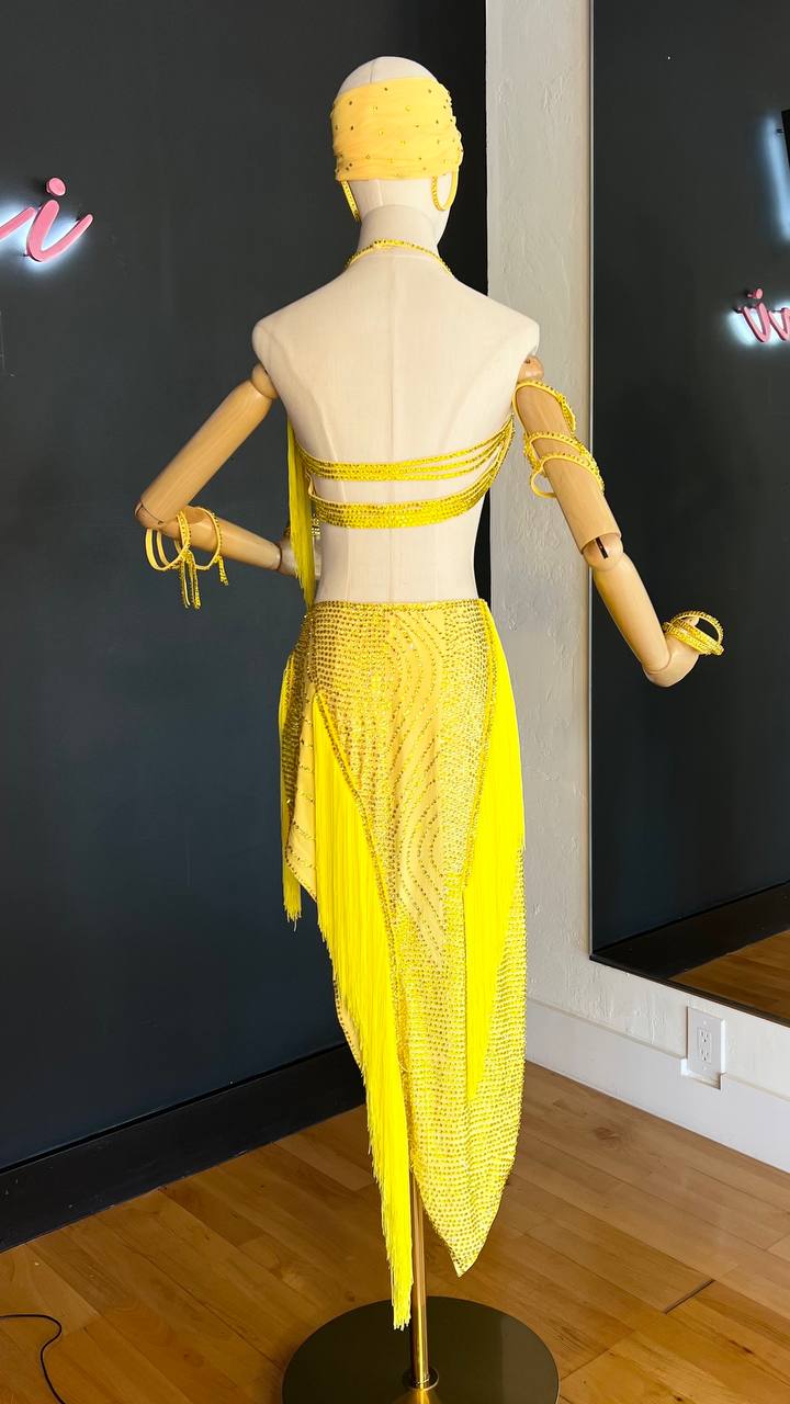 Bring sunshine to the dance floor with the Italian Lemon 🍋 Latin Dress. This used-like new piece features mixed fabrics and high-quality rhinestones, adding a radiant sparkle to every move.