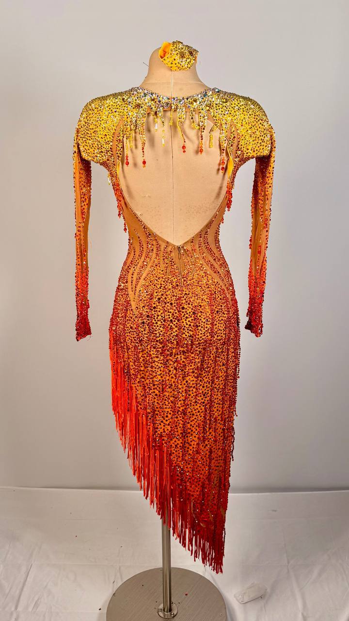 Turn up the heat with the electrifying Mango Fire Latin/Rhythm Dress by Grand Amour. Designed in a bold and juicy mango hue, this stunning piece is crafted from mixed premium fabrics and adorned with high-quality rhinestones that sparkle brilliantly with every movement. Its radiant color and shimmering details create a powerful stage presence that’s impossible to ignore.