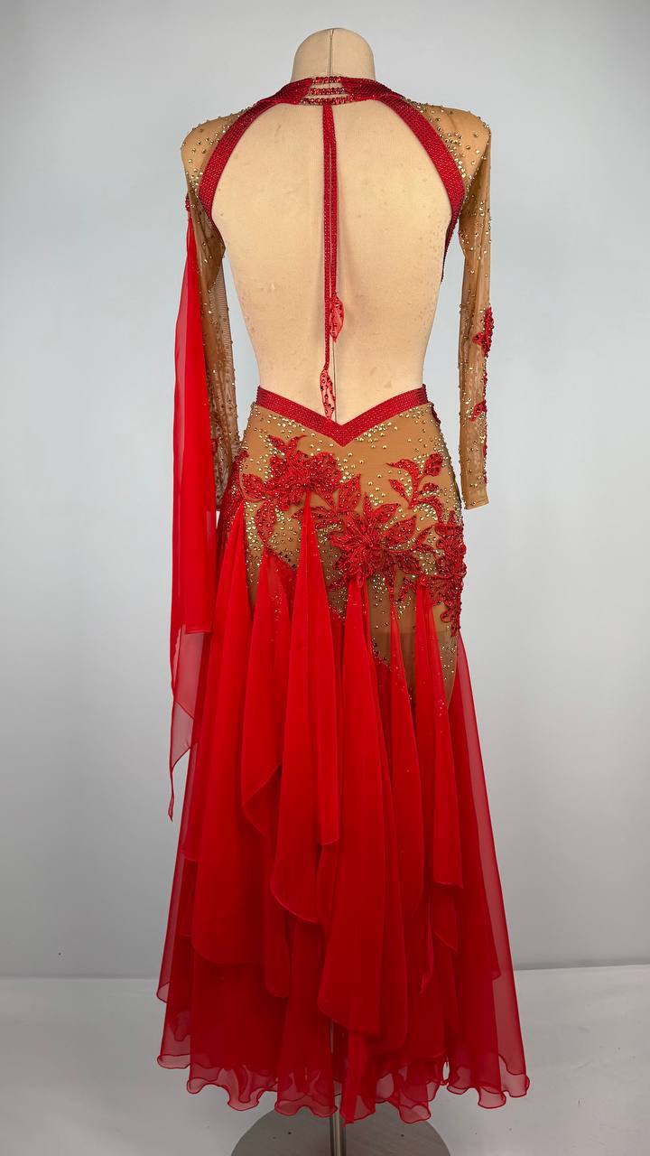 Thoughtfully altered by DanceDiscover for a perfect fit, this AD original offers both artistry and function. Whether you're gliding across the ballroom or striking a dramatic pose, the gown’s flowing lines and sparkling embellishments ensure you're unforgettable.