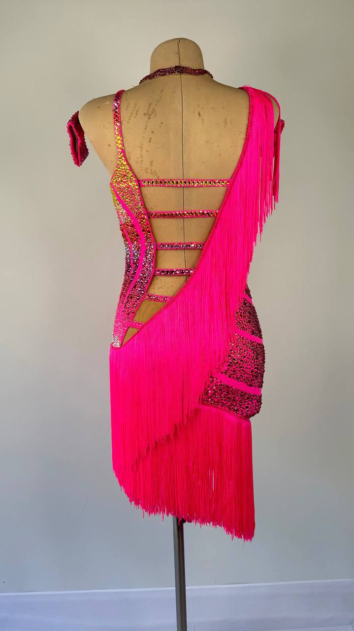 Turn up the energy in the Rainbow Fringes π Latin/Rhythm Dress. Designed in a bold fucsia shade, this dress features mixed fabrics and high-quality rhinestones that sparkle beautifully as the fringes move with every step.