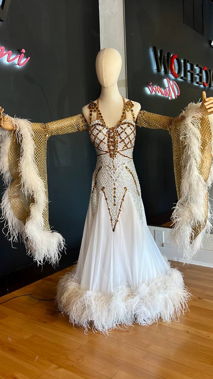 Grace the floor like royalty in the Royal Lady 🫅 Ballroom Dress. This used-like new beauty blends white and gold tones, crafted from mixed fabrics and adorned with high-quality rhinestones that shimmer with every movement.