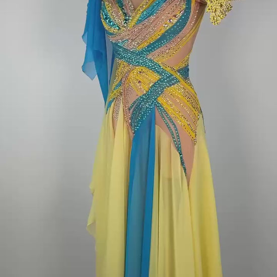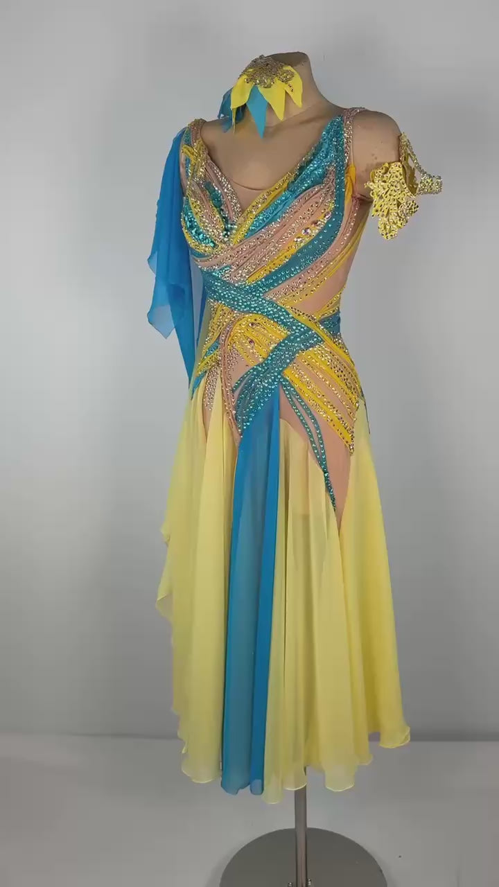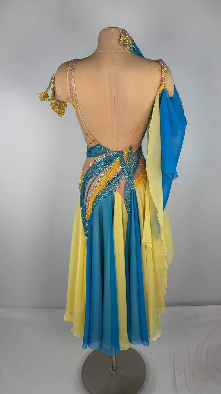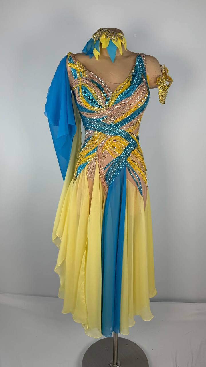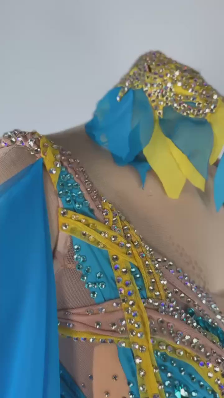This radiant Sunflower Sky 🌻 Smooth Dress is a vibrant choice for dancers between 5'4" and 5'6". The stunning yellow and blue design, crafted with premium mixed fabrics and embellished with high-quality stones, brings elegance and energy to every performance. In like-new condition, this dress is perfect for XS/S sizing, offering a unique blend of style, comfort, and charm that ensures you dazzle on the dance floor. ✨ Price: $1800.