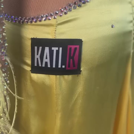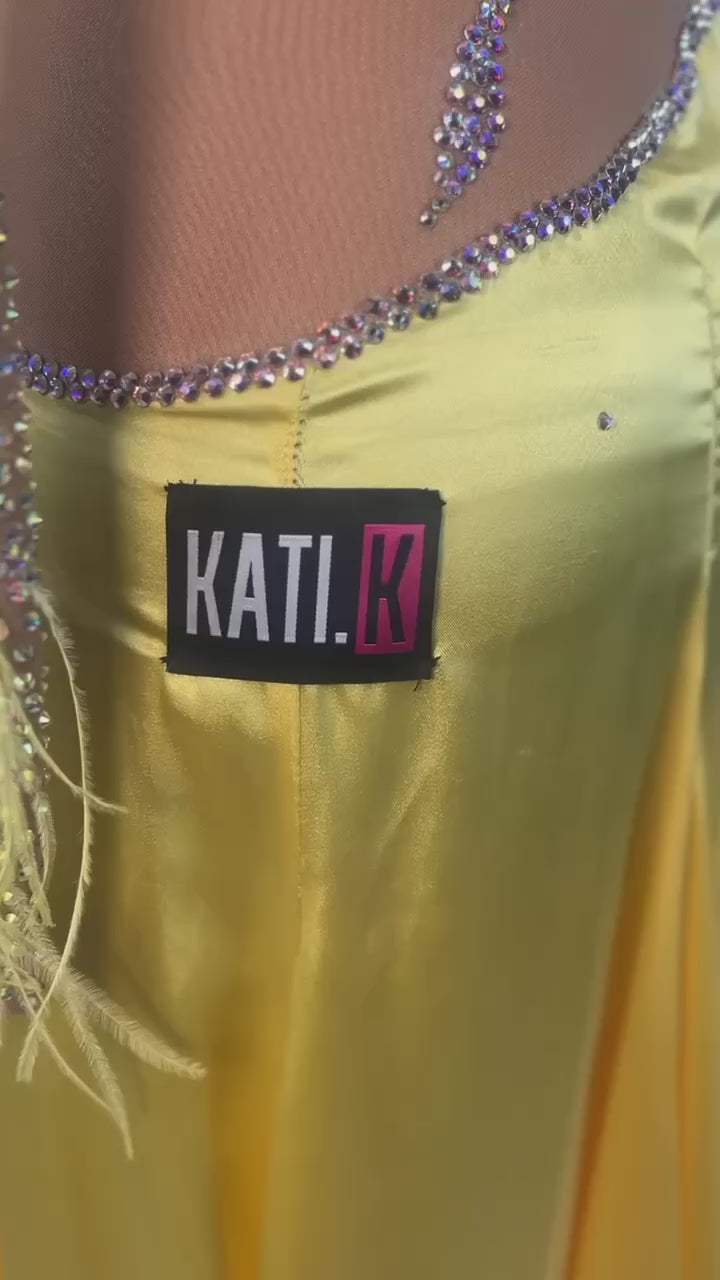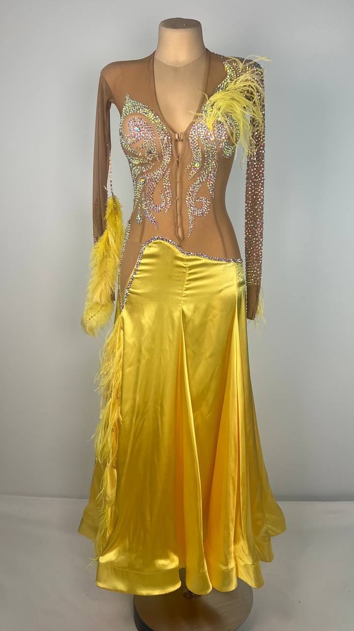 Step into the spotlight with the Sunlight Glow Smooth dress by KatiK! Radiating warmth in a stunning yellow hue, this exquisite dress features a blend of mixed fabrics and high-quality stones, making it the perfect choice for dancers looking to shine.