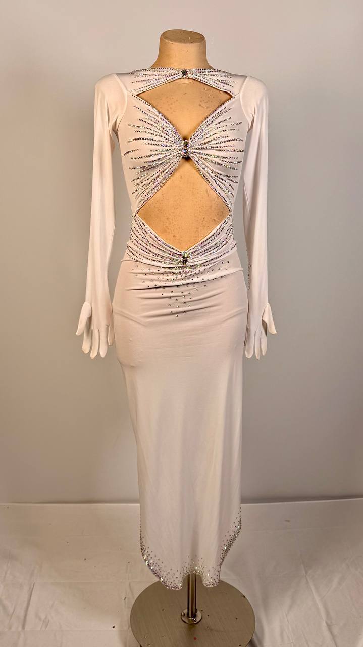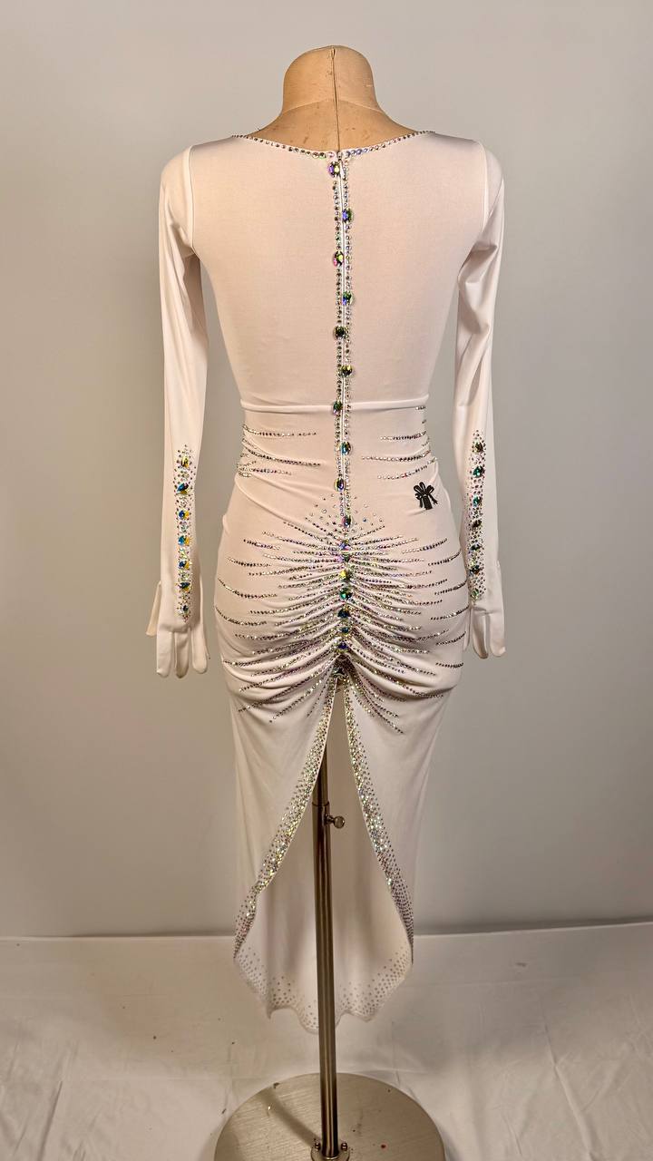 Step onto the floor with fresh confidence in the White Glove π€ Latin/Rhythm Dress. Designed in a crisp white, this dress is crafted from mixed fabrics and finished with high-quality rhinestones that sparkle beautifully with every movement.