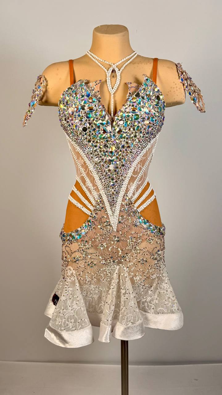 Embrace the elegance of the season with the breathtaking Winter Lace Latin/Rhythm Dress by Grand Amour. Designed in a timeless white hue, this stunning piece is crafted from mixed premium fabrics and delicately adorned with high-quality rhinestones that shimmer like fresh winter frost under the lights. Its refined silhouette and luminous sparkle create a look that is both soft and powerfully captivating.