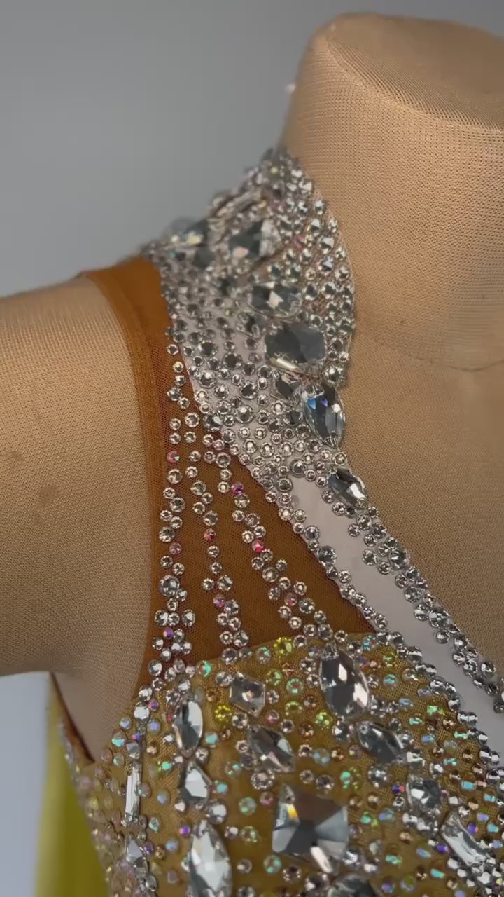 Brighten up the dance floor with Yellow Tale ☀️ - Smooth Dress! This vibrant yellow dress from DanceDiscover FASHION is crafted from premium Chrisanne fabric and adorned with Swarovski stones for a radiant sparkle. Ideal for dancers 5'4" to 5'6" and sized XS/S, this like-new piece has been gently used but remains in excellent condition.